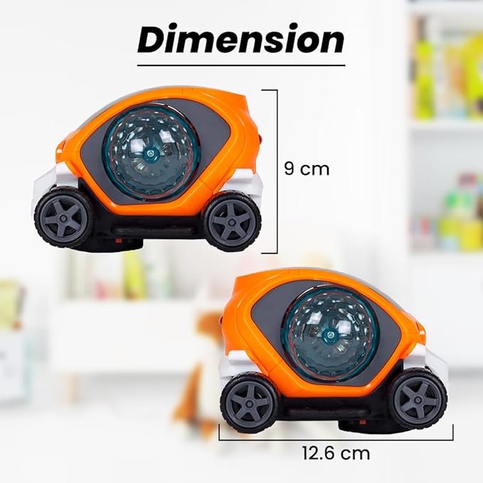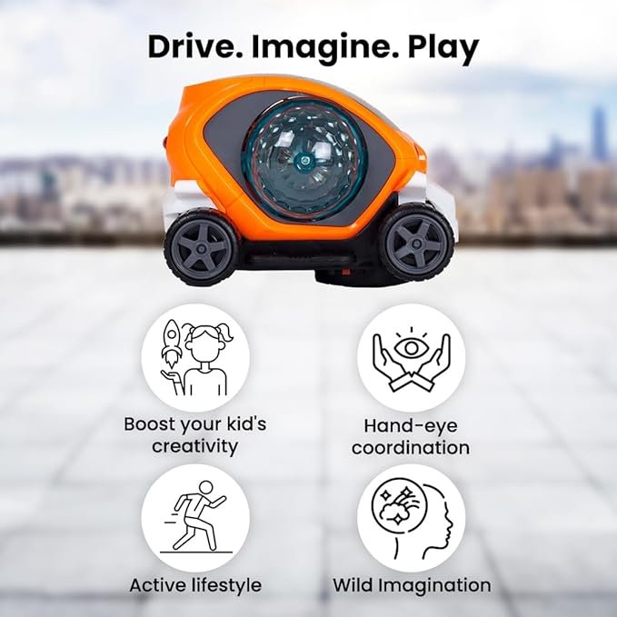 • Random Movement: The car has a 360° rotating wheel in the middle. The wheel supports random movement. This feature makes the car fun to play with and it keeps the kid curious, as it does not have a dedicated path or trajectory to follow.